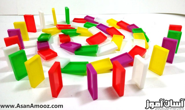 300 قطعهی پلاستیکی در 5 رنگ داخل کیف. یرای چیدن به شکلهای مختلف و انجام بازی هیجانانگیز دومینو (هل دادن یکی از مهرهها به روی بقیه به صورتی که بقیهی مهرهها هم به ترتیب روی هم بیفتند .(