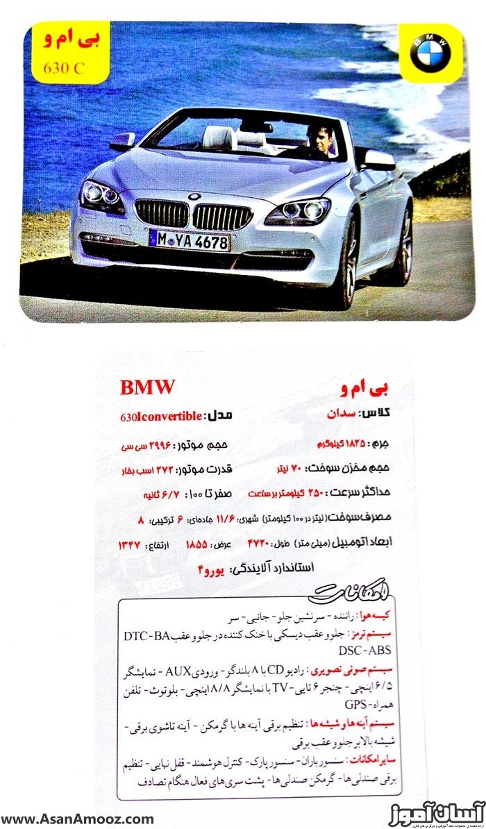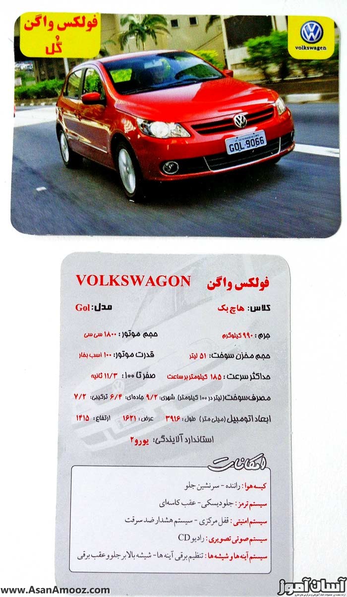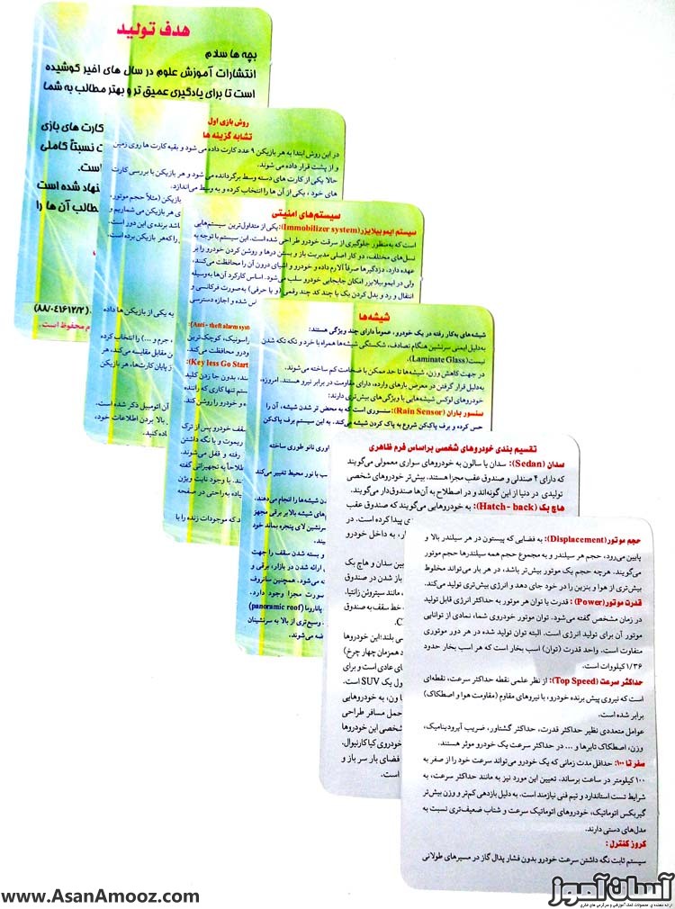 حاوی 30 عدد کارت پشت و رو، برای شناختن ویژگی‌های خودروهای شخصی معروف + 6 کارت معرفی اتومبیل‌ها براساس فرم ظاهری، شناسایی انواع سیستم‌های ترمز و سیستم‌های پایداری، شیشه‌ها و سنسورها، سیستم‌های امنیتی